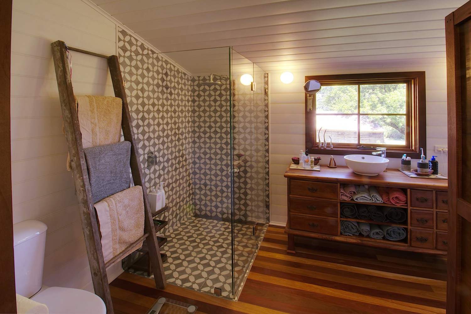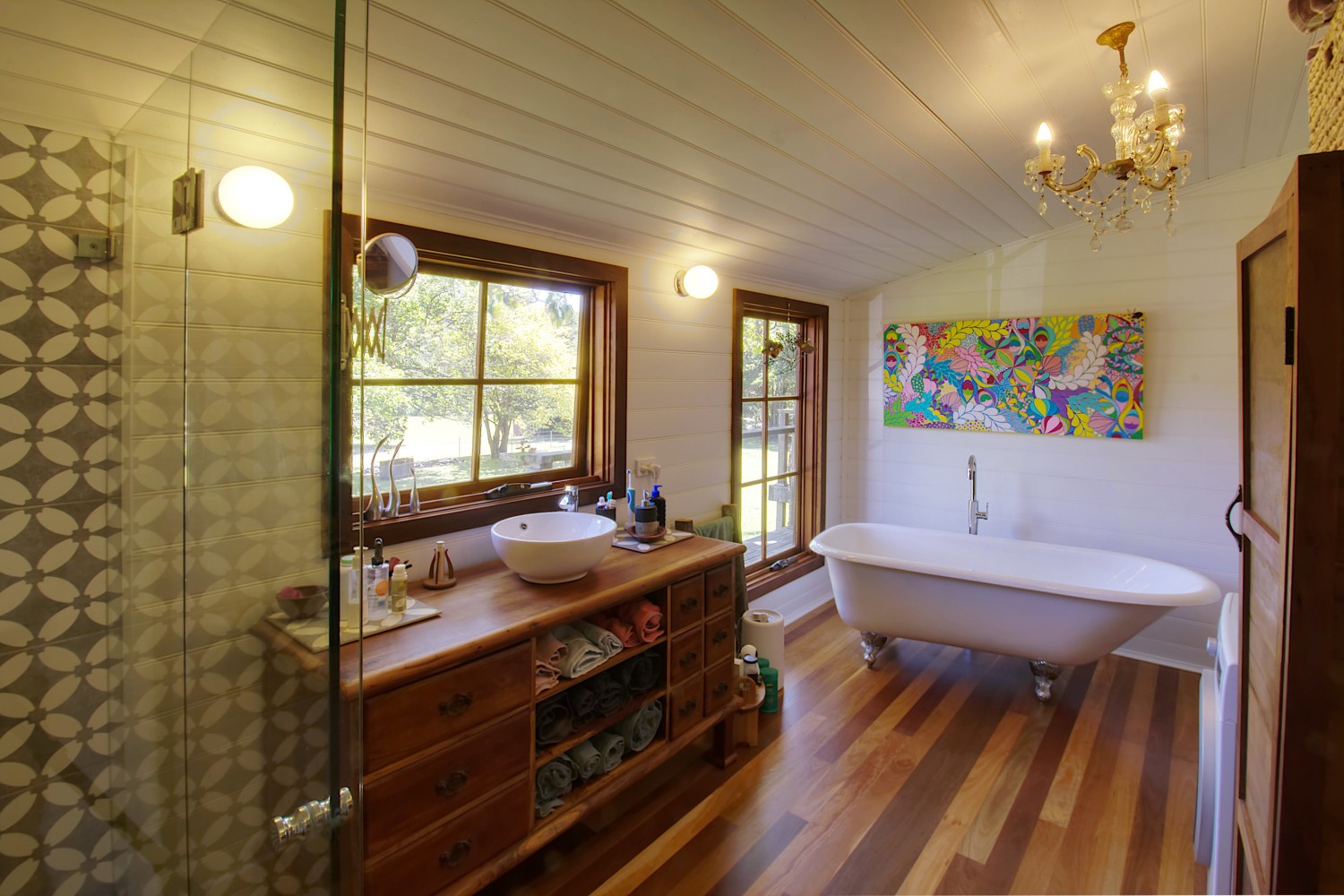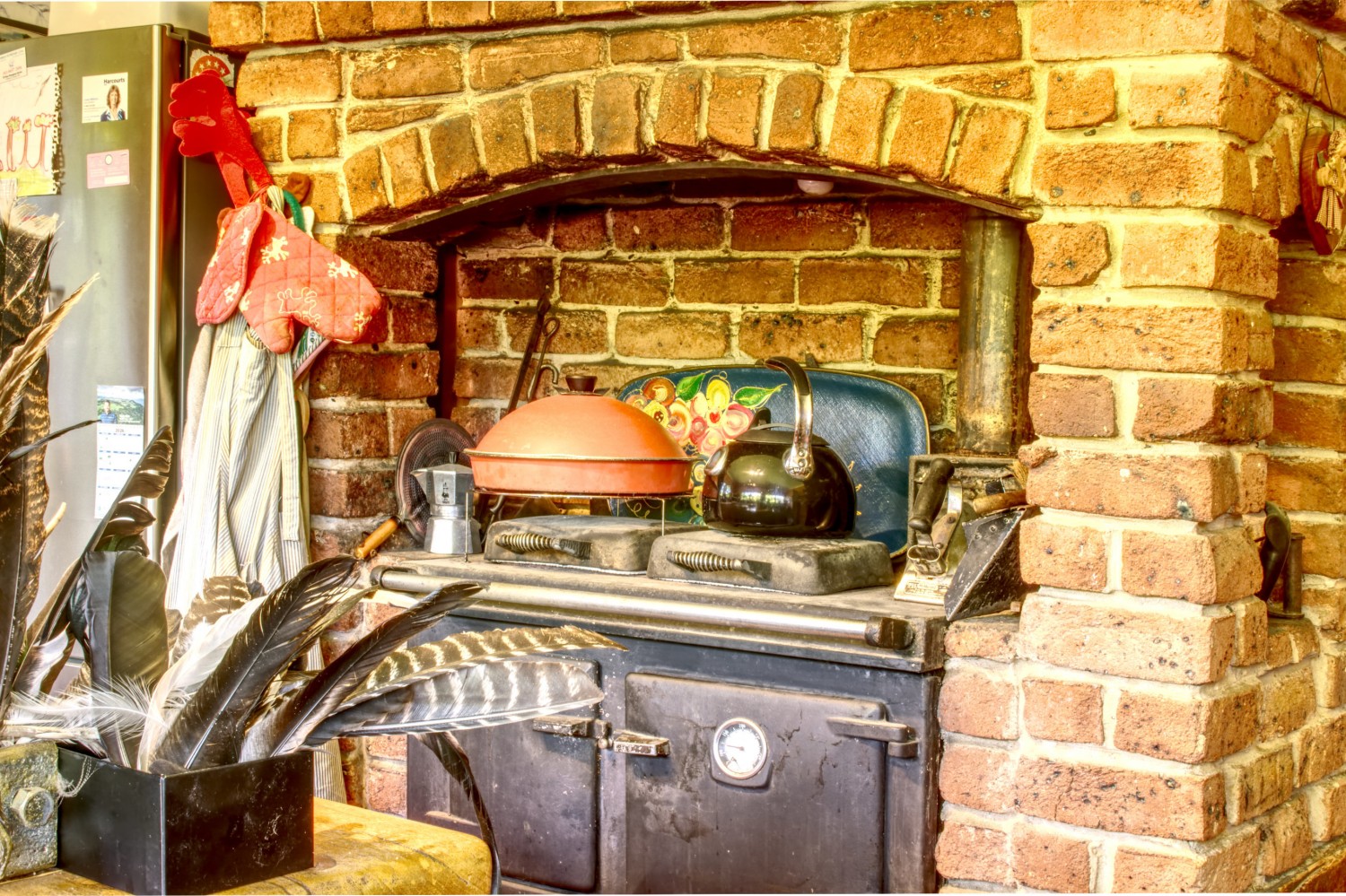 - Large kitchen with rosewood benches and cabinetry, combustion stove with hot water jacket and instantaneous gas hot water, both plumbed